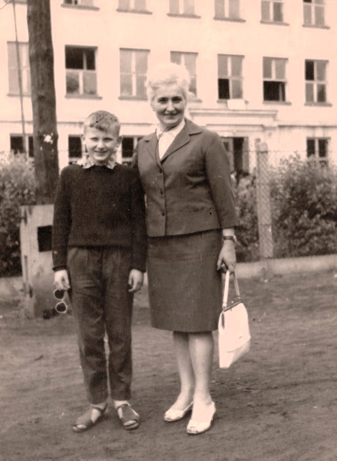 Grzegorz Barczyk (czwarty od prawej) wraz z rodziną (w kolejności od prawej): mamą Ewa Popiel-Barczyk, jej siostrą Zdzisławą Jaszczak oraz jej dziećmi: Katarzyną oraz Jackiem. Zdjęcie zrobione przez jego ojca przy pętli tramwajowej w czasie świąt Wielkanocnych. Zdjęcie zostało przekazane w 2024 roku, kiedy w wieku 97 lat zmarł Wiesław Barczyk — autor fotografii.